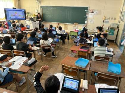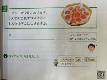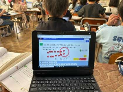 2年生の算数の学習の様子です。教科書のQRコードを使って問題をといています。おはじきを端末上で動かしたり、手入力で式を書いたりすることもできます。