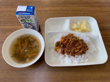 今日の給食は、タコライス、もずくのスープ、焼きじゃが、牛乳でした。