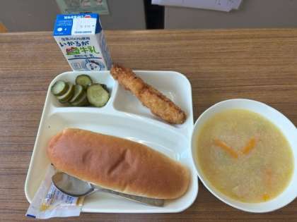 今日の献立は、サーモンフライ、豆乳スープ、きゅうりのバジル風味サラダ、みかんジャム、コッペパン、牛乳です。