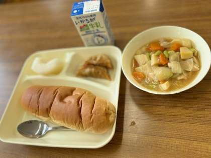 今日は、あげギョーザ、鶏肉ととうがんの中華煮、なし(豊水)、パン、牛乳です。なしは調理員さんが皮をむいてくださいました。ありがとうございます。