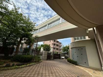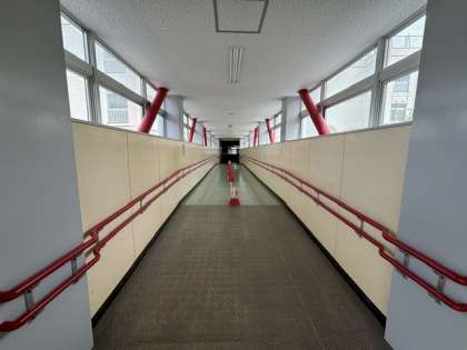 本校は、道路を挟んで二つの校舎があります。渡り廊下でつながっています。