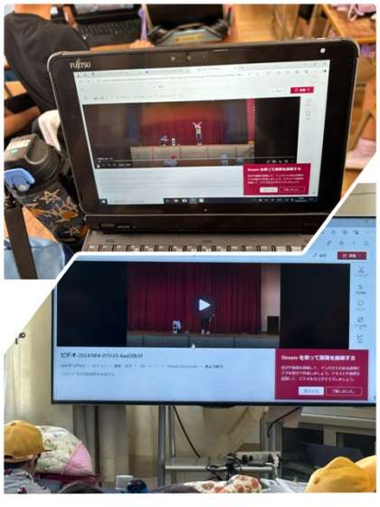 学習者用端末を毎日持ち帰り家庭学習を工夫しています。今日は、動画をみて運動会の団体演技の練習です。