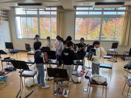 紅葉が美しい音楽室から、楽しげな音楽が聞こえていました。休み時間のことです。誰に「練習しなさい」と言われたわけでもないのに、今学んでいる曲を自分たちで自主的に練習している子どもたち。練習というより音楽を楽しんでいる姿は、本当に楽しそうでした!