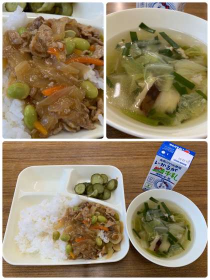 ピリ辛丼と中華スープ、とても温まるメニューです。