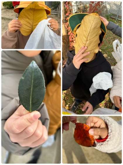 色とりどりの形の違った葉っぱや木の実をみつけました。