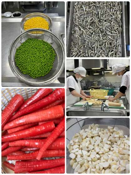今日の給食は、さて何でしょうか。ヒントは、お正月に食べます。調理員さんが朝から一生懸命作ってくれています。