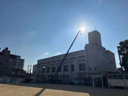 プール濾過機工事が本日から3月まで行われます。クレーン車で濾過機を上げ下ろしします。安全第一で実施いたします。