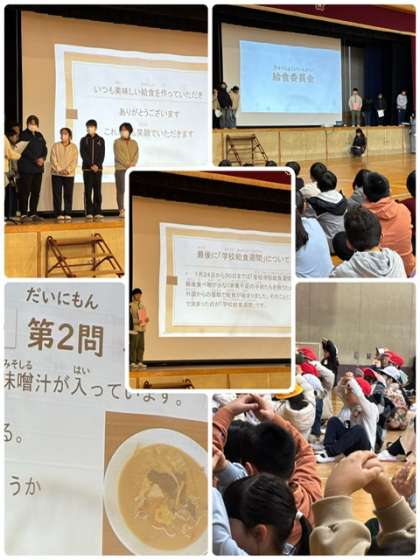 学校給食週間です。給食委員会のクイズを楽しんだり給食調理員さんに感謝の気持ちを伝えたりしました。