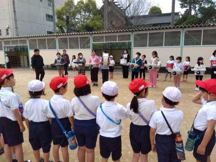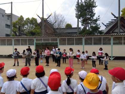 鼓笛隊が、運動場で1年生に演奏を披露しました。