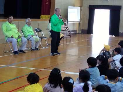 児童朝会で、見守り集会を行いました。生野区役所、地域見守り隊の方にきていただき、感謝の気持ちを伝えました。、