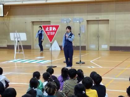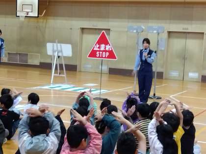 生野警察署の方に指導に来ていただきました。低学年は、〇×クイズで楽しみ、道路の歩行の仕方を教えていただきました。