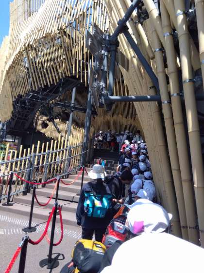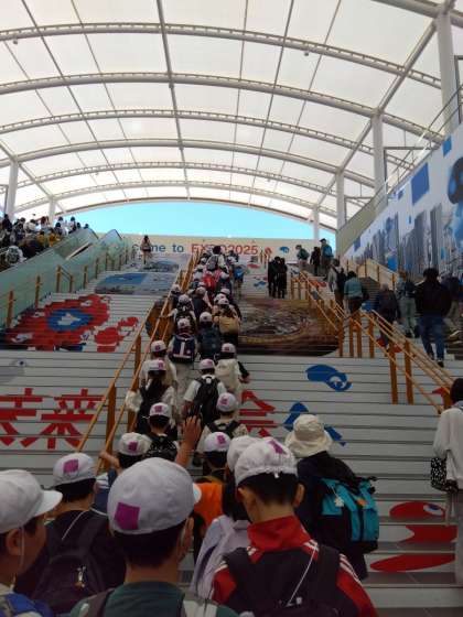大阪万博に行ってきました。大阪メトロもスムーズに乗ることができました。万博の入場ゲートでも待ち時間なしで入場することができました。入場後、学級記念写真を撮り、3、4年生は最初にマレーシア館に入りました。