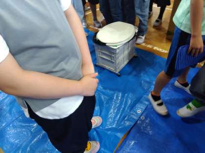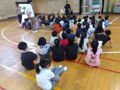 本日の土曜登校日に、生野消防署、生野区役所、地域防災リーダーの方々に指導に来ていただき、防災学習を行いました。災害避難所設置に使用する「簡易トイレの使い方」、火災時を想定した「煙体験」、初期消火時の「消火器の使い方」を学習しました。