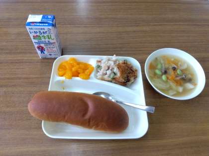 今日の給食は、マカロニグラタン、ウインナーとキャベツのスープ、ミカン(缶)、黒糖パン、牛乳でした。