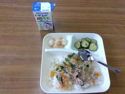 今日の献立は、豚丼、きゅうりのかつお梅風味、白玉だんご、牛乳でした。