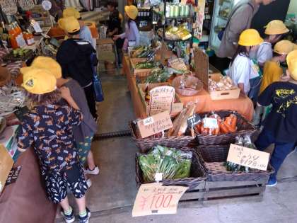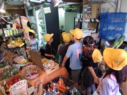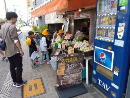 町たんけんで、八百屋さんに行きました。珍しい野菜や果物がたくさんありました。野菜から出した「だし」で作った「おでん」や野菜から作った食べ物もたくさん売っていました。