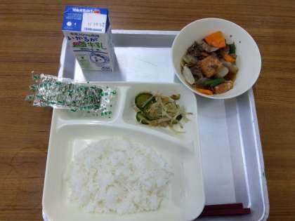 本日の献立は、牛肉と野菜のいため煮、きゅうりともやしのおひたし、焼きのり、ごはん、牛乳でした。