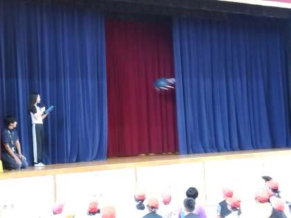 今日の児童集会は、講堂舞台上のカーテンとカーテンの間を「何」が飛んでいったかを当てるクイズでした。