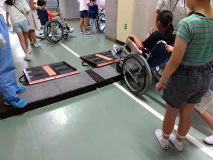 車いす体験をしました。友達をのせて、スロープを後ろ向きに下りたり、段差を乗り越えたりしました。