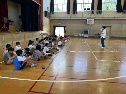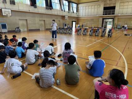 大阪リハビリテーションセンターから車いすを持ってきていただき、車いすの説明をしていただき、乗る体験、おす体験をさせていただきました。