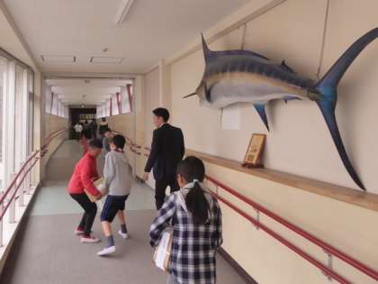 図工室は道路を超えた西棟。その渡り廊下には大きな大きなカジキ