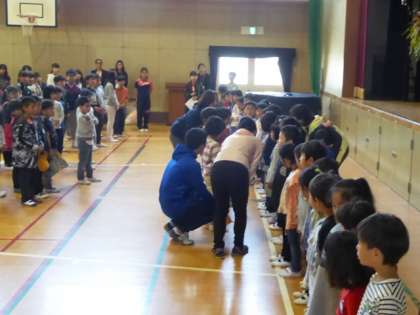 先ず、6年生の代表児童が「お迎えのことば」、2年生からは「花の種」のプレゼントです。