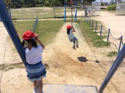 午前中は学年ごとに大型遊具で遊んだり、みんな遊びをしたりしました。みんなあそびでは4年生はだるまさんが転んだで盛り上がり、3年生は大繩で盛り上がっていました。
