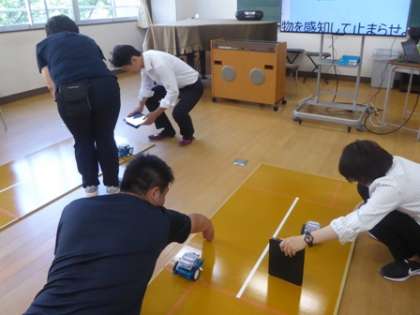 他校から見学に来られた先生方のために、「mBot」という小さなロボットを使ったプログラミング体験。私自身見たことがないのでちょっと覗きに行ってきました。
