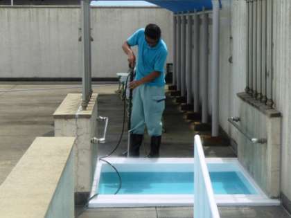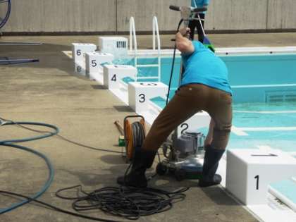 すでに、昨日から汚れきった水が抜かれ、プールの底面は顔をのぞかせています。でも、見に行く時間が早すぎて、清掃はスタートしたばかり、まずはプールサイドからでした。