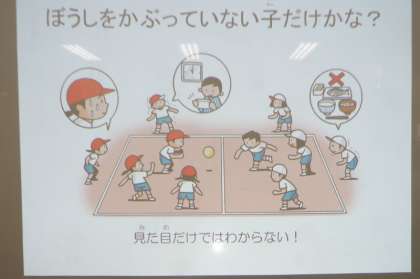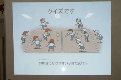 6月の体重測定の時間を使って「熱中症を防ごう」という保健指導をしました。熱中症のおきるしくみや症状、防ぎ方を簡単に説明したあとクイズをしました。絵を見て、熱中症にかかりやすい子を当ててもらいます。外では帽子をかぶることも熱中症予防のひとつだと習ったばかりなので、「帽子をかぶっていない子が熱中症になる」という声があちらこちらから上がります。でも本当にそうかな? その子だけかな? 次のスライドに移ると・・・しんどくて汗だらだらの子、寝不足でよろよろの子、朝ごはん抜きでふらふらの子の絵があらわれます。熱中症は睡眠不足や食事抜きといったことからもおこるのだということを気づいてほしいなと思います。子どもたちに就寝時間を聞いてみると、高学年だけでなく低学年でも12時ごろまで起きているという子がいます。何をしているのか聞くと、ユーチューブやアニメを見たり、ゲームをしたりしているという答えが返ってきます。また朝ごはんについても、たまたま時間がなくて食べていないという子もいれば、中にはいつも食べないという子もいます。食べる時間がなかったらジュース一口でもいいから口に入れてねと話しています。“早寝早起き朝ごはん”の生活習慣を整えて、元気に夏を乗りきりたいものです。