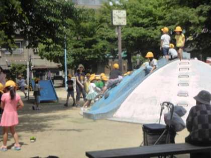 公園で憩いの時間を過ごしておられる地域の方々に見守られながら、子ども達は時間いっぱい公園の中を走り回り、遊具で楽しく遊んでいました。