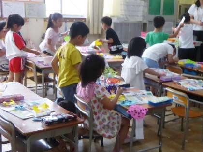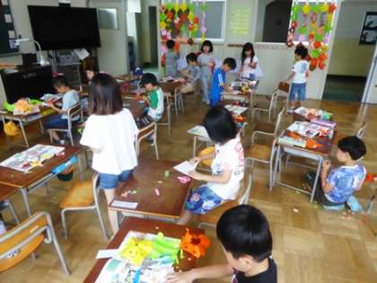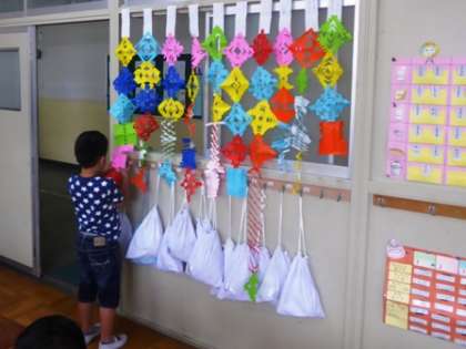 「チョキチョキかざり」はきれいに窓際につるされました。