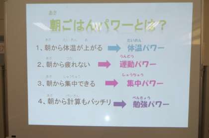 11月の体重測定時の保健指導は「朝ごはんパワー」です。黄色グループ、赤グループ、緑グループの食品がバランスよく並んだ朝ごはんには、からだを動かしたり、頭をつかったりするときに必要なエネルギーがつまっています。朝ごはんをしっかり食べるには、夜早く寝ることが大切。夜早く寝ると、朝もすっきりと起きることができます。すると朝ごはんもゆっくり時間をかけて食べることができます。早寝早起き朝ごはんで、パワー全開。毎日食べる習慣を子どものときからつけておきたいですね。朝ごはんパワーで今日も元気に過ごしましょう。