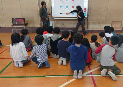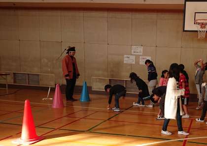 石をいろいろな方法で投げたり、けったりして的に当てる遊びです。