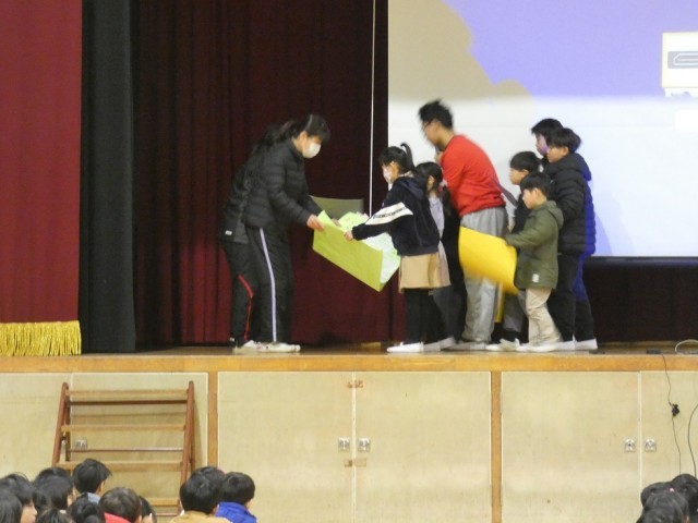 児童集会で、給食委員会が発表をしました。「給食委員会の仕事の紹介」「給食クイズ」をし、最後に給食調理員さんに感謝の気持ちを伝えました。