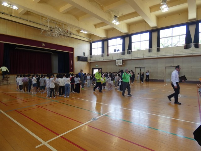 本日の児童朝会は、日頃朝の登校を見守っていただいている「見守り隊」の方々とあいさつをしました。学校長からの「みなさんは、見守られ、大切にされています。」自分自身でも「安全で安心して、元気よく生活できるようにしましょう。」というお話のあと、見守り隊の方々を子どもたちに紹介しました。見守り隊を代表して、村上様から「あいさつは、今日一日の大切な力になります」「家で家族と、学校で先生や友達と、地域で会った人とあいさつをしましょう。」「自分の身は自分で守って、がんばりましょう」「今年のたそがれカーニバルは、8月ではなく、5月30日(土)に行います。楽しい一日になるようにしましょう」というお話でした。その後、生野区役所パトロール隊の山田様からは、「パトロール隊は、子どもたちが安全に安心して登下校できるようにパトロールしています。パトロール隊の目が届かないことがあります。その時は、自分のことは自分で守るように。友達や周りにいる大人に大きな声で助けを求める。110番の家の旗を見たことがありますか。危ない目にあいそうになったら、旗のある家に逃げ込んで、警察に連絡してもらうことができます。」というお話でした。