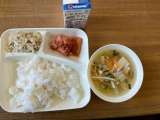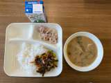 もずくと豚ひき肉のジューシー さつまいものみそ汁 焼きれんこん ごはん 牛乳です...