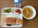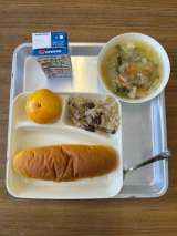 今日の献立は、パンプキンパン、牛乳、金時豆の中華おこわ、みかん、中華スープでした...