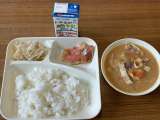 今日の献立は、豚肉といかの中華煮、大学いも、黄桃、パン、牛乳です。豚肉といかの中...