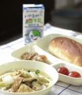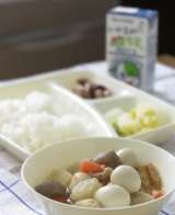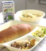今日の献立は【豚肉と野菜の煮もの・なにわうどん・プチトマト・おさつパン・牛乳】で...