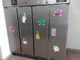 5月28日(水) 給食室の牛乳保管冷蔵庫には、かわいいイラストの学年表示がありま...