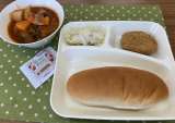 今日の給食は【牛肉のデミグラスソース煮、スープ、きゅうりのピクルス、いちごジャム...