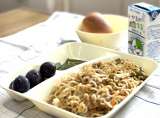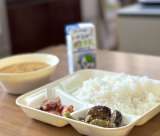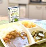 今日の献立は【チキンカレーライス(米粉)、きゅうりとコーンのサラダ、白桃(カット...