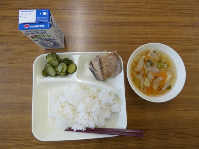 1月16日(金)本日の献立は、さばのみそ煮、五目汁、きゅうりの甘酢づけ、ごはん、...