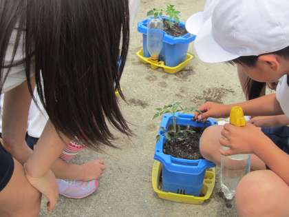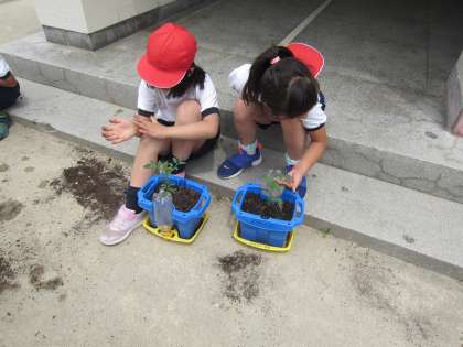 5月14日(火)2年生の児童が生活科の学習でミニトマトを自分の鉢に植えました。学習園には、さつまいもの苗を植えて育てます。