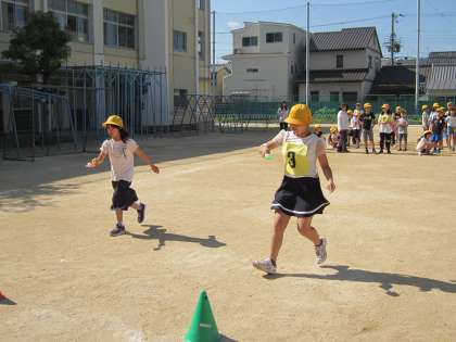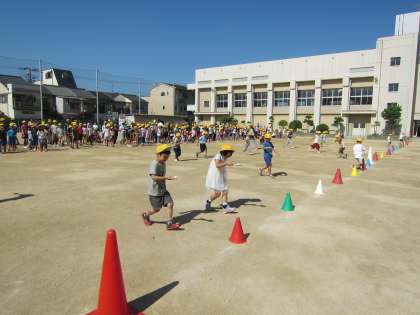 今日の児童集会は、たてわり班対抗のピン球リレーです。みんなピン球を落とさないように工夫して走って次の友達につないでいました。