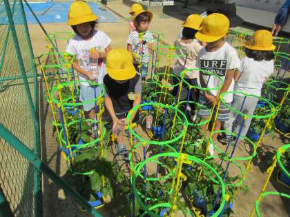 毎日、子ども達は自分の植木鉢のアサガオやミニトマトに欠かさず水やりをしています。2年生が育てているミニトマトはかなり花が咲き小さな実ができています。