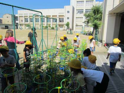 1・2年生の子ども達が育てている、アサガオとミニトマトがぐんぐん成長しています。
