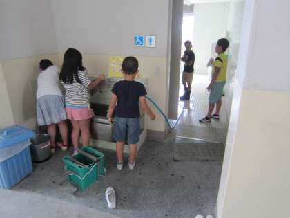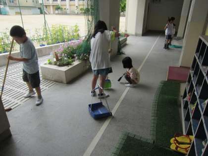 朝の児童集会で話し合った、たてわり清掃を行いました。高学年の児童が掃除の仕方などをたてわり班のメンバーに教えて、協力して掃除を行っていました。