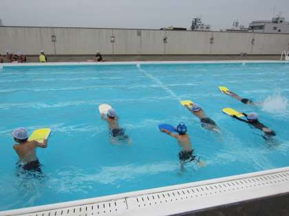 水泳の学習が始まってから約3週間がたちました。今年は、今のところそれほど雨で学習ができないという日はありません。1年生もすっかり水に慣れ、ビート板を使ってバタ足の練習をするようになりました。